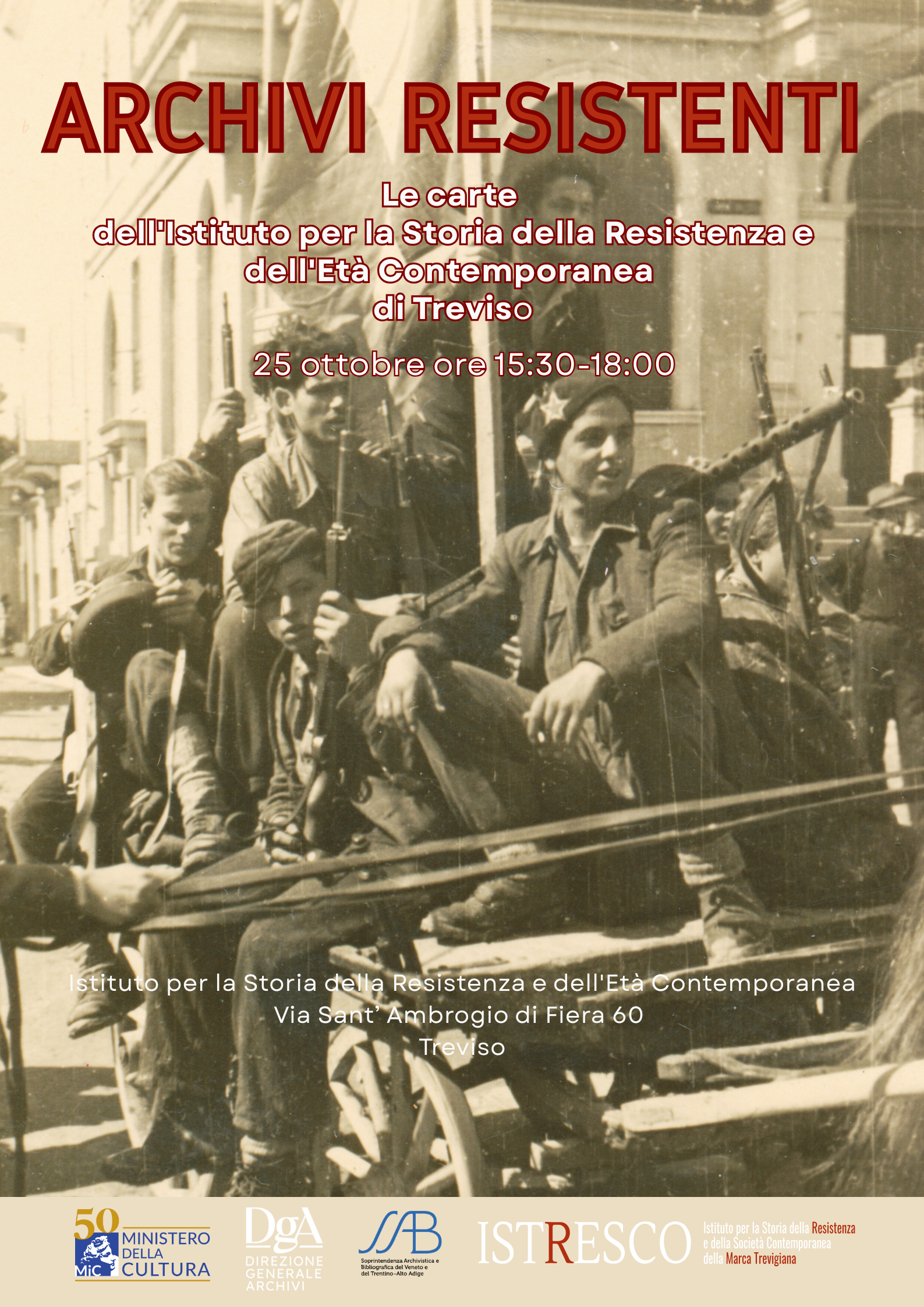 25 ottobre, ore 15:30-18:00 Istituto per la Storia della Resistenza e dell’Età Contemporanea, Via Sant’ Ambrogio di Fiera 60, Treviso L’evento si inserisce nel ciclo di iniziative Archivi Resistenti proposto dalla Soprintendenza per ricordare gli ottant’anni della Liberazione, ricorrenza che ha offerto l’opportunità di costituire un itinerario alla scoperta degli archivi e delle biblioteche degli Istituti per la Storia della Resistenza e della Società Contemporanea, patrimonio fondamentale per la storia italiana non solo resistenziale, in quanto si sono ormai arricchiti con consistenti fonti prodotte in epoca contemporanea e con alcuni nuclei di documentazione più antica.