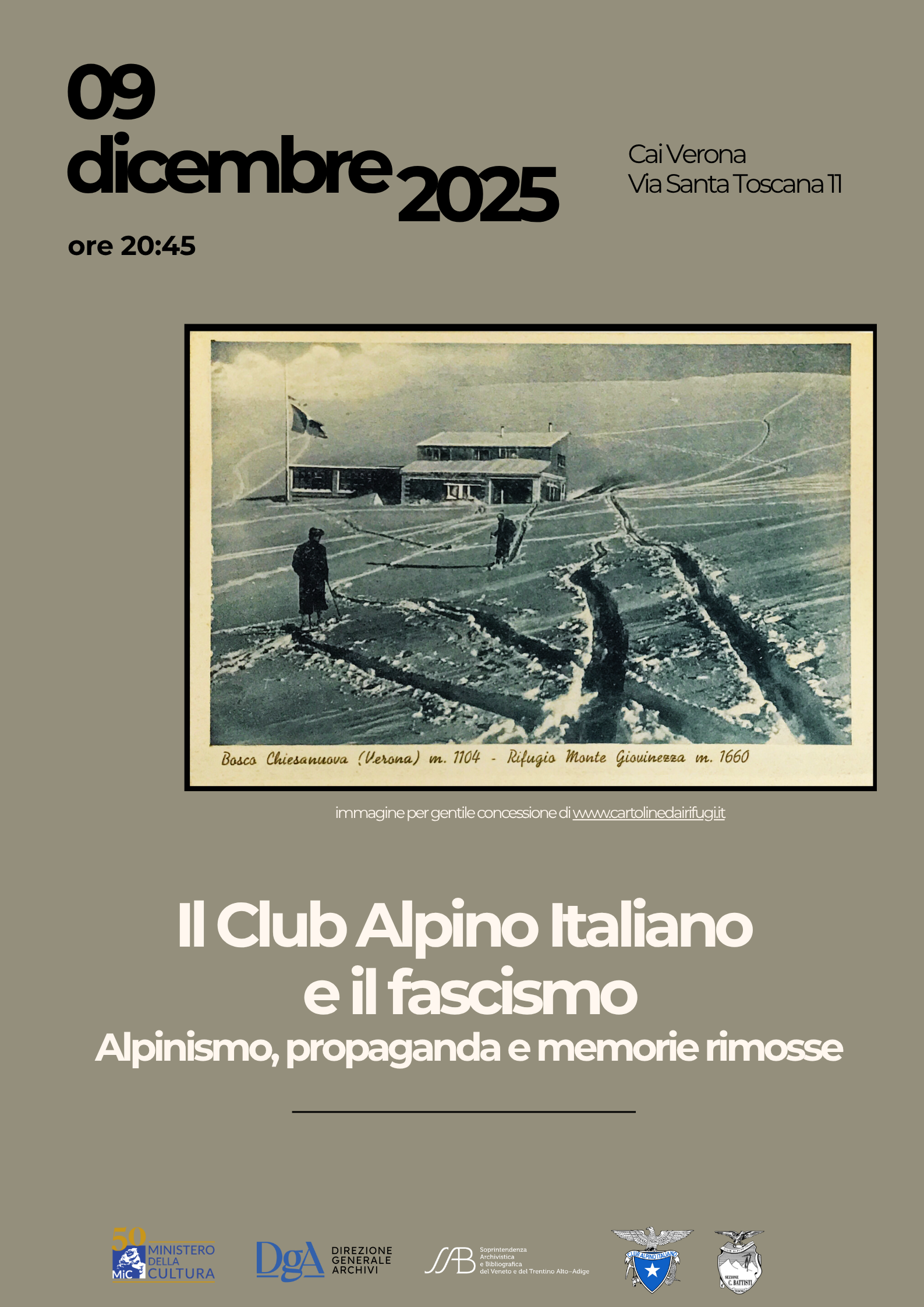 9 dicembre 2025, ore 20:45, C/O sede del CAI Verona, Via Santa Toscana, 11 L’incontro propone un’analisi del rapporto tra il CAI e il regime fascista, esaminando i processi attraverso i quali l’alpinismo italiano venne progressivamente inquadrato nelle politiche e nelle direttrici culturali del regime.
