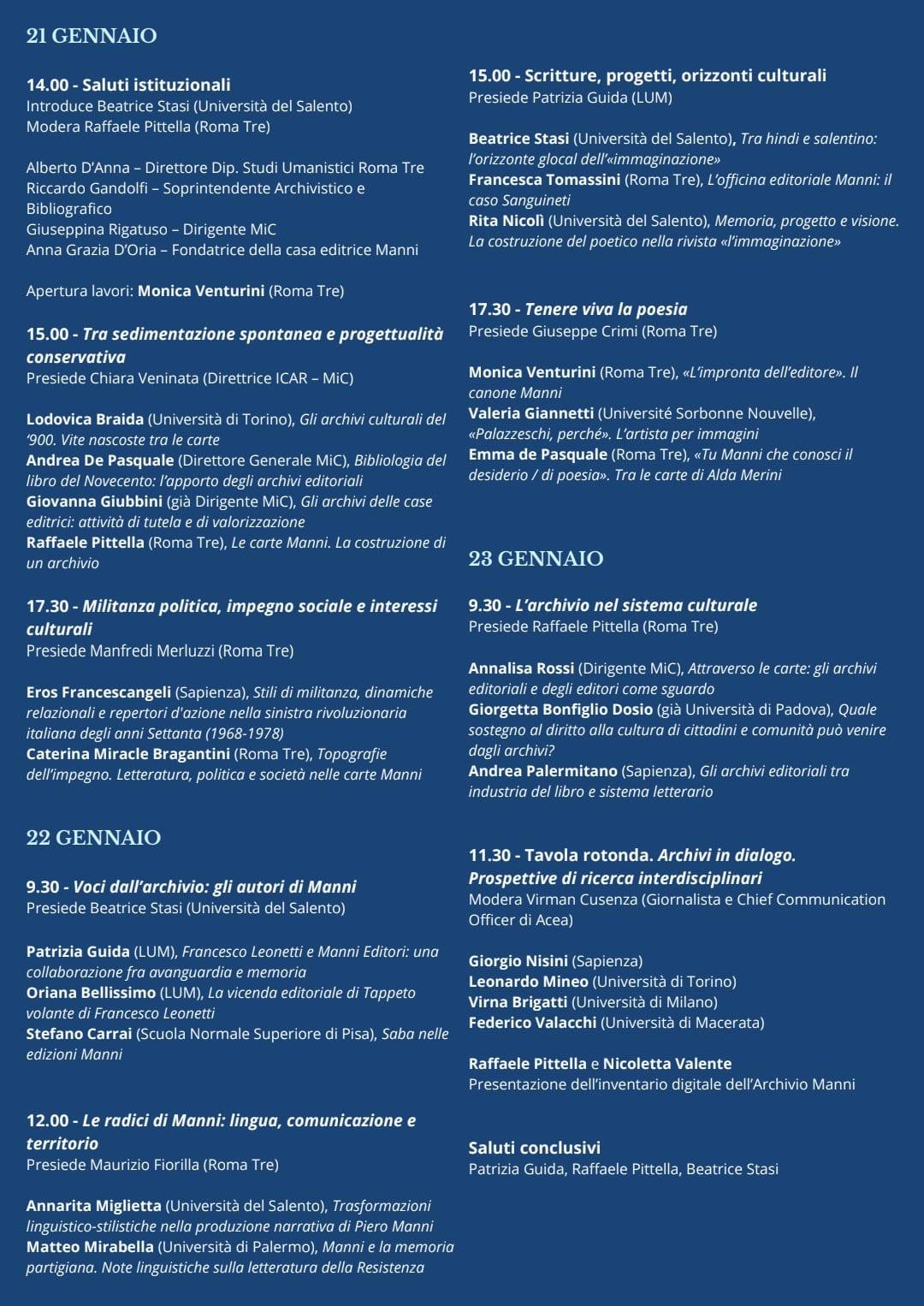 Il convegno riunisce studiose e studiosi del campo archivistico e letterario con l’obiettivo di approfondire le peculiarità dell’Archivio Manni D’Oria, analizzato anche in prospettiva comparativa e nelle sue potenzialità di ricerca storica e critico-letteraria, con particolare attenzione ai temi della conservazione, della valorizzazione e dell’accesso ai fondi editoriali.