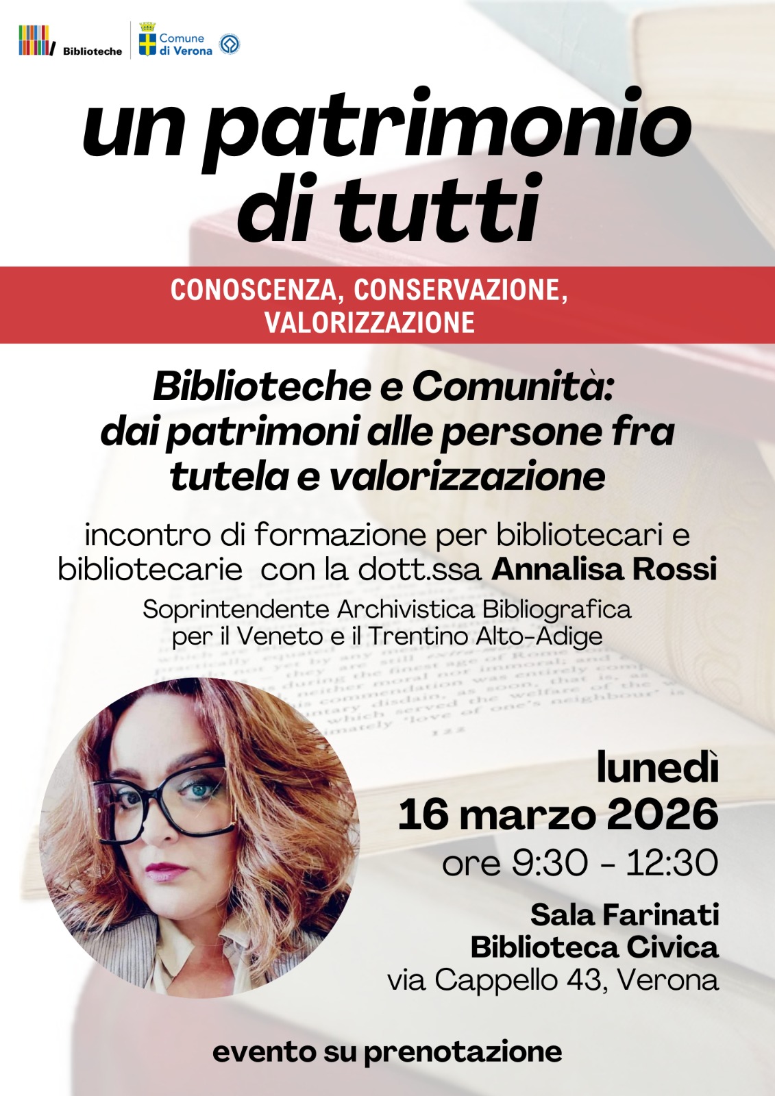16 marzo 2026, ore 9:30 – 12:30, Sala Farinati Biblioteca civica di Verona, via Cappello 43 Incontro di formazione per i bibliotecari con la partecipazione della Soprintendente archivistica e bibliografica Veneto e Trentino Alto Adige, dott.